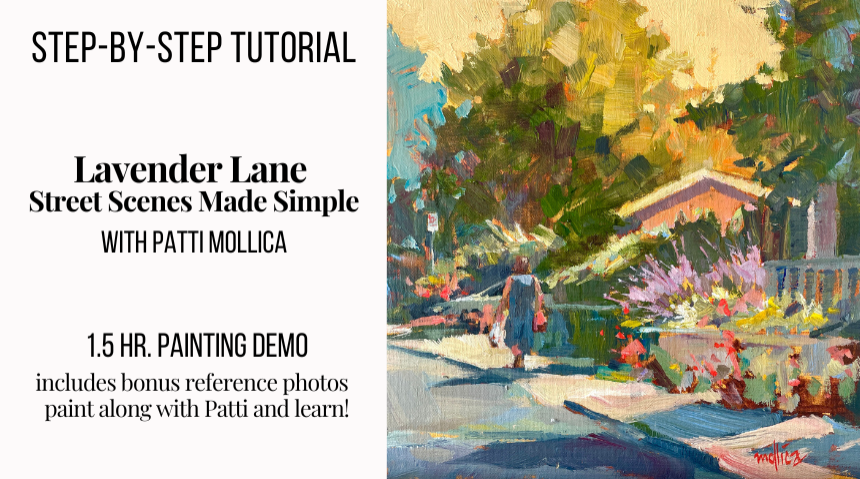 Bring sunlight, florals, and painterly charm to life in this fresh, feel-good mini-course! Whether you're new to street scenes or want to loosen up your edges, Lavender Lane walks you through painting a peaceful neighborhood filled with blooming color and soft shadows. You'll follow Patti's simple block-in process, using two main values to establish structure, then layer in expressive color mixes and gestural brushwork to suggest trees, flowers, and dappled light. No need for tight rendering—the goal is to capture the mood of a quiet street glowing with early evening light, all with bold shapes, atmospheric color, and just enough detail to keep it believable and beautifully loose.